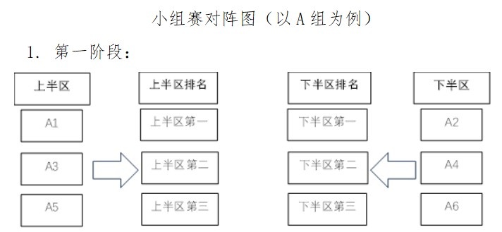 (1)赛会制,组内6支球队分为上、下两个半区(组序1、3、5号位为上半区、组序2、4、6号位为下半区),每个半区内的3支球队先进行单循环比赛。根据单循环比赛排名再进行两轮交叉赛。