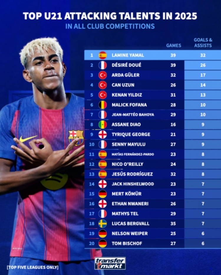 10月10日讯 德国转会市场盘点了2025年俱乐部层面各项赛事参与进球最多U21球员,亚马尔39场32球居首,杜埃39场26球位居次席。