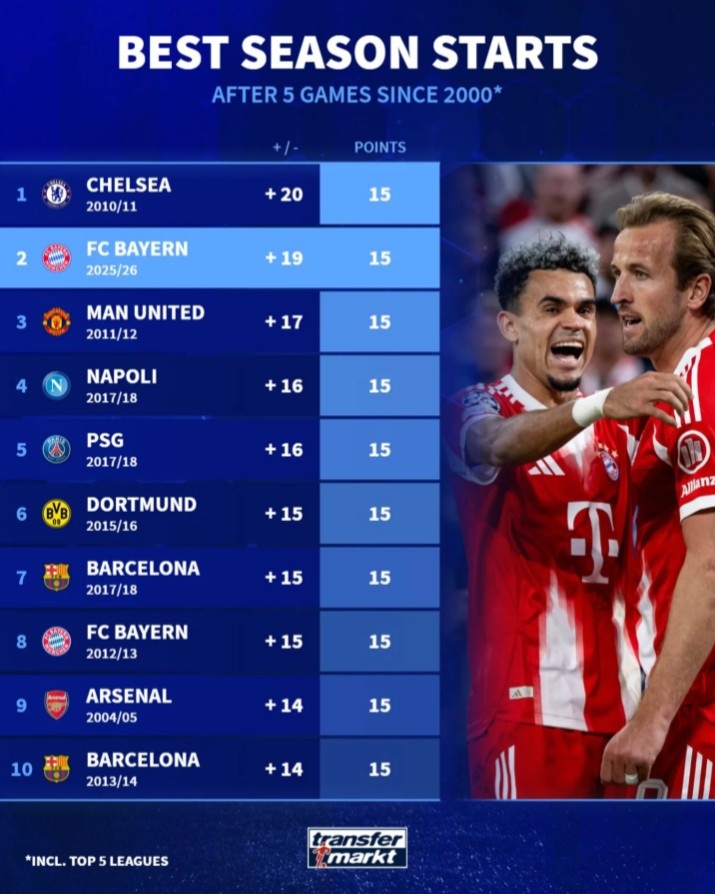 9月29日讯 德转列出本世纪五大联赛开局5轮后最佳战绩,本赛季拜仁5连胜19个净胜球排在第二位,切尔西10/11赛季5连胜20个净胜球第一。